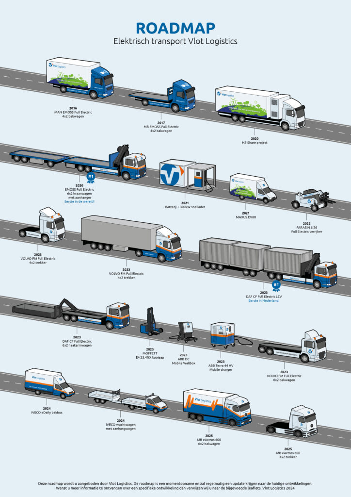 Afbeelding rechts: De roadmap is een overzicht van het elektrisch transport binnen Vlot Logistics. Per voertuig is er een specificatieblad ontwikkeld met eigenschappen en details. Indien u de roadmap of specificatiebladen wenst te ontvangen, vermeldt u dat dan in uw bericht.